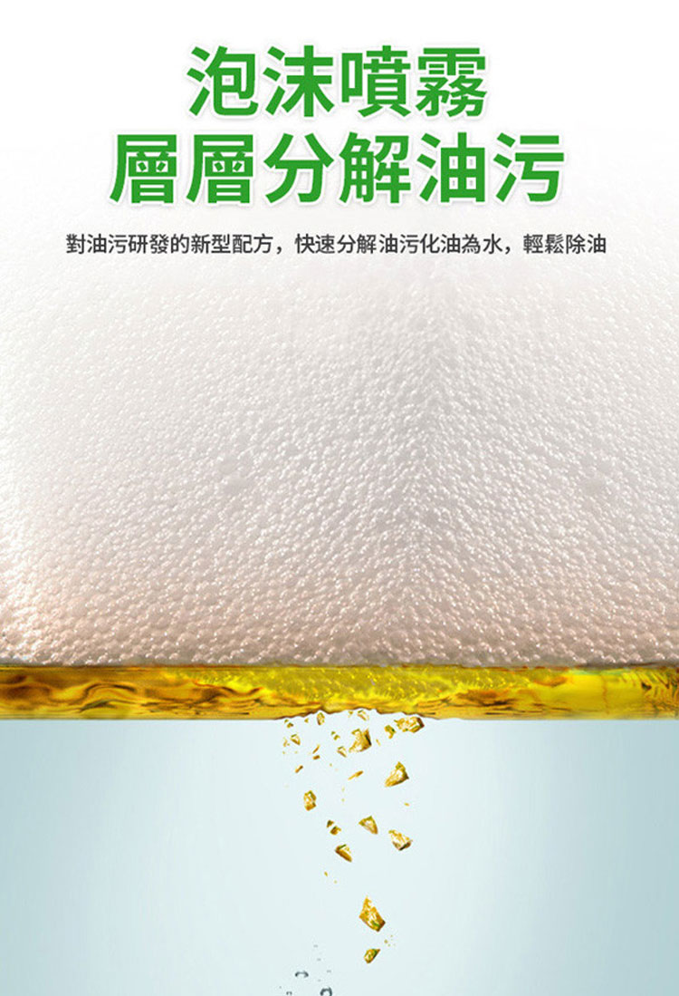 全新升級 ~廚房重油垢清潔劑泡沫噴霧,簡單對抗縫隙頑漬,採用日本新科技除焦油垢、解重油脂配方,流理台、瓦斯爐、抽油煙去除油汙清潔慕斯清潔劑對手部的傷害,且不傷器物表面。廚房去油慕斯環保配方清新不刺鼻,強效快速溶解油汙能力。